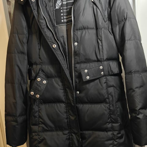 Vilan kaunis talvitakki/untuvatakki tummansinisenä, kokoa M mutta menee hyvin myös koossa S. Ihanan lämmin kovillakin pakkasilla ja muhkeus tallella. Takissa on huppu, joka irroitettavassa vetoketjulla ja lisäksi napeilla irrotettava karvareunus. Materiaalikoostumus sisältää 50% untuvaa ja 50% höyhentä. Siisti kuntoinen. Helmassa sivuilla vetoketjut, hyvät taskut kauttaaltaan.