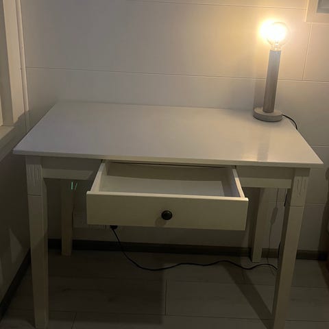 Kauniin punainen pöytä valkoisilla teräsjaloilla.