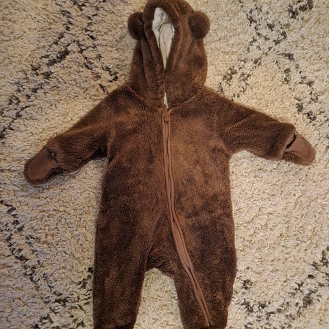Hyväkuntoinen, suloinen ja lämmin nalleasu vauvalle, koko 56. Pesty hajusteettomalla pesuaineella, koiratalous. Voin lähettää, nouto Sellolta myös ok.