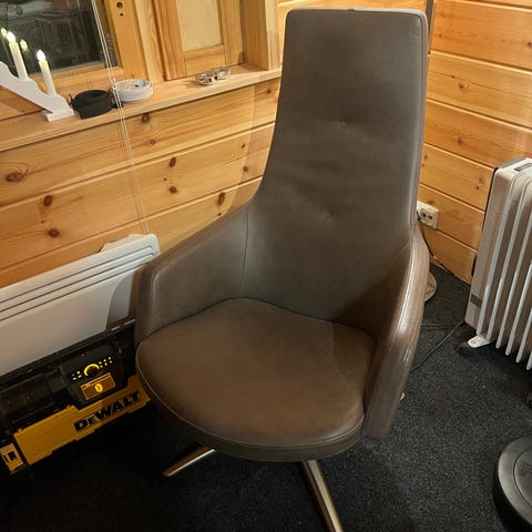 Design Conform Joy High-mekanismituoli on kauniisti muotoiltu ja moderni lepotuoli rahilla. Väriltään lepotuoli ja rahi ovat tummanharmaasta nahasta ja harjattu alumiinijalat. Mekanismituolissa on linjakas istuin, jonka kaari jatkuu yhtenäisenä selkänojan yläosasta käsinojaan. Lepotuoli ja rahi yhyteishintaan 950 euroa.