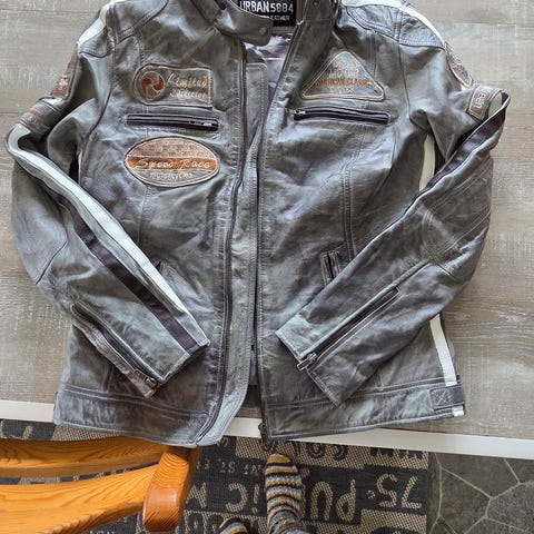 Richa Leather musta nahkatakki. Takissa on valkoiset raidat hihoissa ja vetoketjulliset taskut. Sisäpuolella on irrotettava vuori ja lisävuori. Tämä jäi minulle boudausharrastuksen takia pieneksi ennen kuin ehdin ottaa käyttöön. Koko vastaa mediumia. (Nykyiset mittani ovat 170 cm/ 86 kg, hartianleveys 110, ja takki on liian tiukka.)