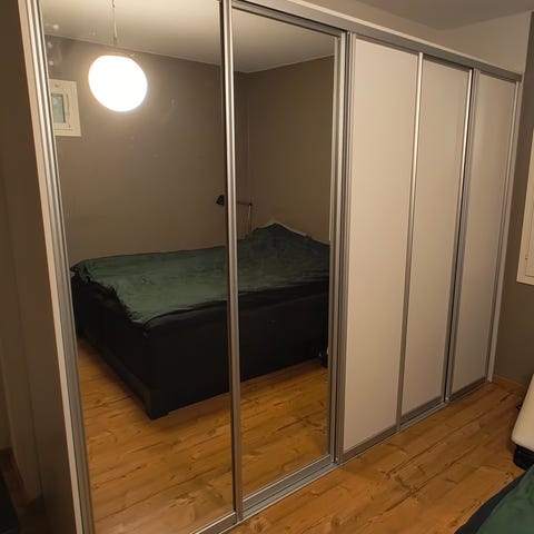 Estrade(Novart) liukuovikaappisto. Alaosassa ovissa messinki kehys/ kupari peili ja yläosassa valkoinen kehys/ valkoinen melamiini. Alaosa kork.210cm ja yläosa 155cm.