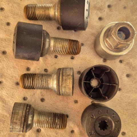 4kpl käytössä olleita kartiokannalla olevia mustia lukkopultteja ja avain. Kierre M14x1,5. Olleet Skoda Superbissa.