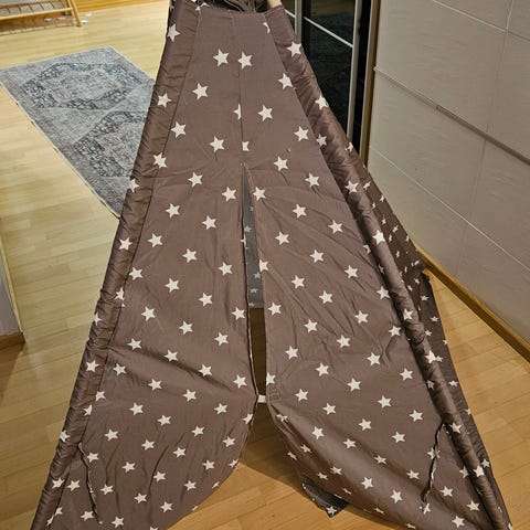 Myydään lasten leikkiteltta (tiipii). Hyvässä käytetyssä kunnossa. Kankaassa on muutamia käytön jälkiä, mutta kankaat ovat kuitenkin täysin ehjät. Pesu jää ostajalle.
