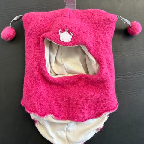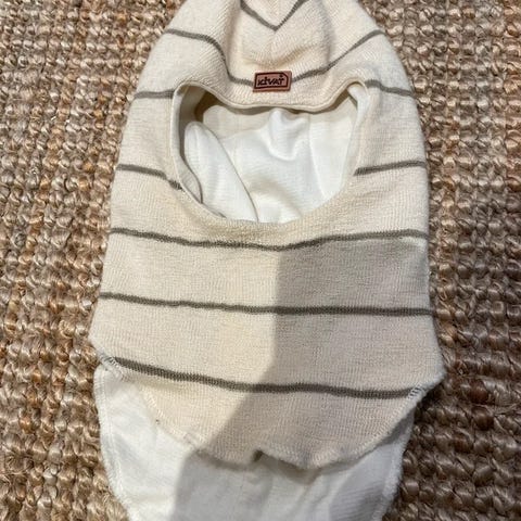 Vihreä kypärämyssy, ulkovuori villaa, sisävuori puuvillaa, koko on 3 eli 5-8 vuotiaille.