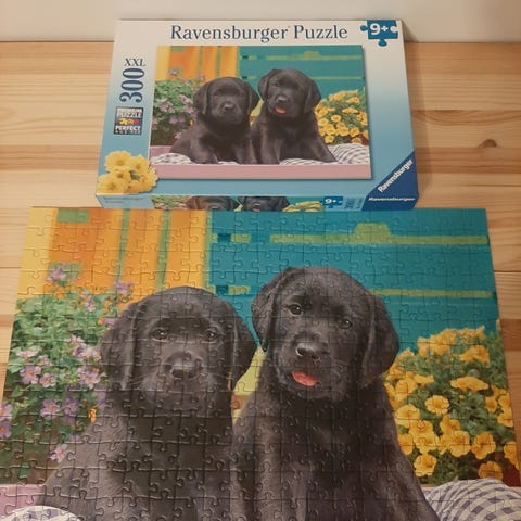 Ravensburger 100 XXL palapeli, jossa on koirakuvio. Palapeli soveltuu yli 6-vuotiaille lapsille. Palapelin koko valmiina on noin 49 x 36 cm. Kaikki palat tallella ja palat hyväkuntoisia.