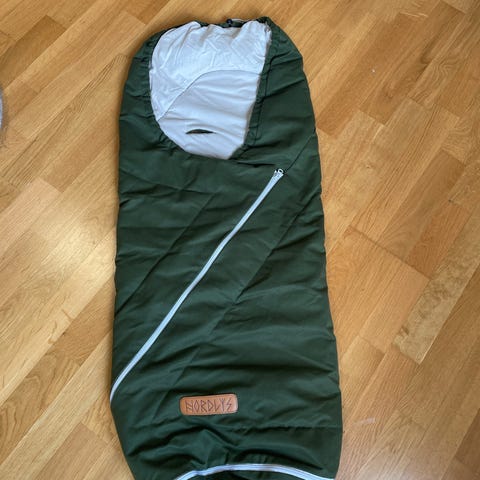 Musta lampaantaljapussi, tässä ei vauva palele kovilla pakkasillakaan. Irronnut kiinnitystarra korjattu ompelijalla, ks. kuva.