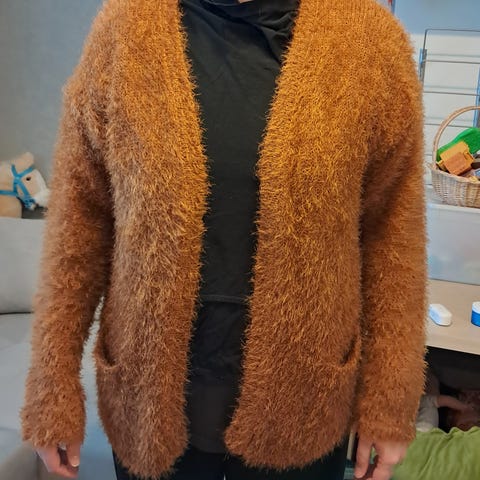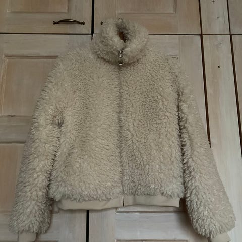 Ihana vaaleansininen pörrötakki ilman vuorta ja tummansiniset joustavat housut.