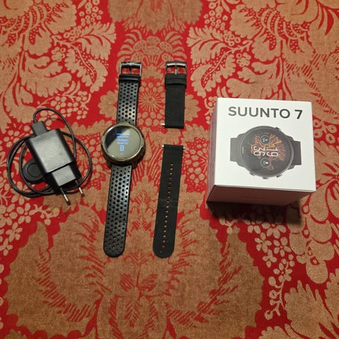 Suunto 7, latauskaapeli, yksi ylimääräinen silikonilenkki rannekkeeseen.
