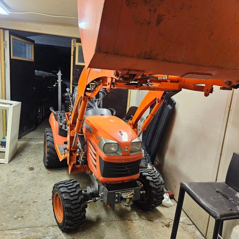 Muu Merkki Kubotassa kiinni ollut takalana ja hiekoitin hydrauliikalla.