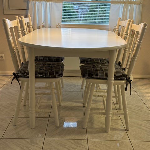 Pöytä jatkopalalla ja 6 tuolia.