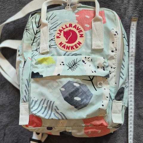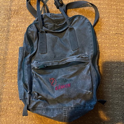 Vanha Fjällrävenin olkareppu. Repussa on päätasku, jonka sisällä pieni verkkotasku, pitkänmallinen kapea tasku, ulkopuolella reilu verkkotasku ja mini verkkotasku. Kaikinpuolin ehjä. Selässä tummentumaa.