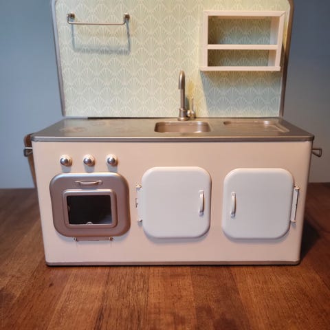 Kullanvärinen Maileg-pöytä. Huom. pinnassa on käytönjälkeä! Jäljet saa kuitenkin peitettyä pöytäliinalla, jos ne häiritsevät.