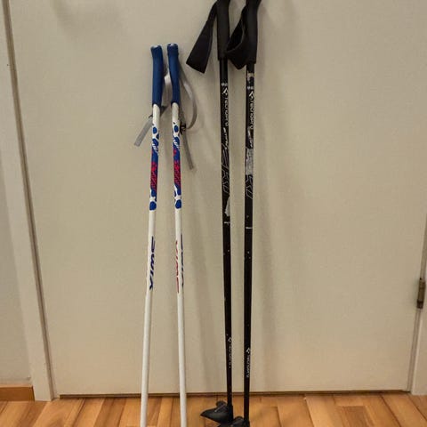 Seuraavalle hiihtäjälle jo kolme lasta palvellut setti. Sopivat noin 125 cm pitkälle hiihtäjälle.