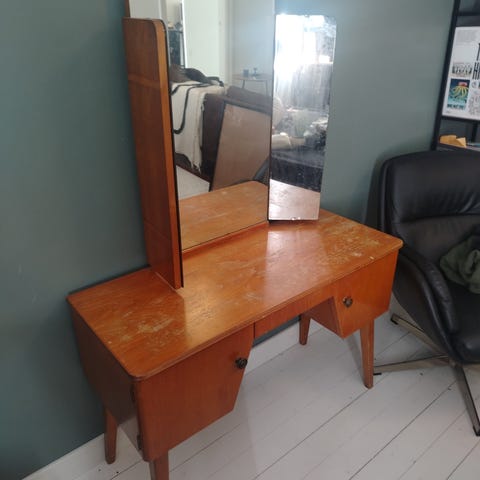 Tummansininen puinen peilipöytä jossa laatikko. Todella hyvässä kunnossa. Tarjoa! Kulkeutuu myös Helsinkiin tai muualle pk-seudulla.