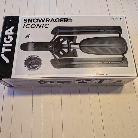 Siisti ja ehjä Stiga Snowracer käsijarrulla (helpompi käsitellä kuin jalkajarrulla), poika kasvoi ulos lumileikeistä.