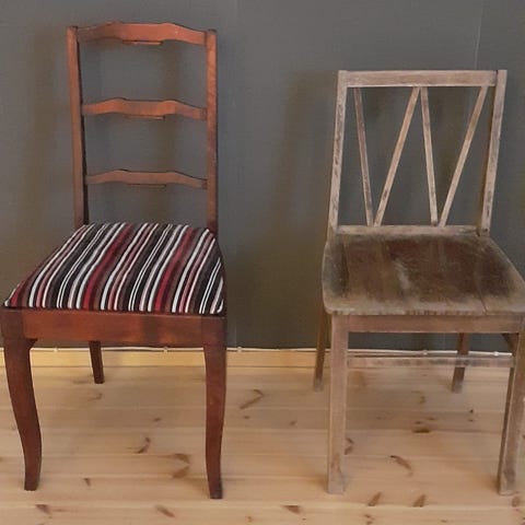 Vanhat, tukevat, tuunatut tuolit. Kankaalla päällystetty. Tuoleja 4 kpl.