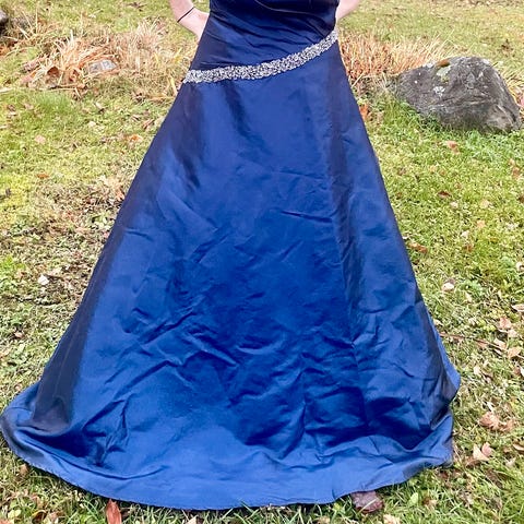 Kaunis juhlapuku vanhojentansseihin tai vähän juhlavimpiin juhliin. Takanyörityksen ansiosta sopii XS, S tai M kokoiselle. Eri valaistuksissa väri muuttuu vihreästä, petroliin ja jopa aavistuksen violettiin. Paljon kauniita paljettiyksityiskohtia. Kahdet tanssit tanssittu.
