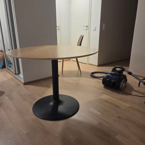 Pyöreä Maskun ruokapöytä, väri musta. Halkaisija 100 cm ja korkeus 73 cm.