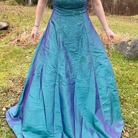 Kaunis mekko vanhojentansseihin tai juhlavimpiin kutsuihin. Kahdet tanssit tanssittu tällä mekolla. Lyhennetty helmasta 160cm + korkokengät pituiselle. Takanyörityksen ansiosta sopii hyvin XS, S tai M-kokoisille. Paljetteja irronnut joitain, mutta niitä ei huomaa etäisyydeltä katsoessa. Huomioitu hinnassa.
