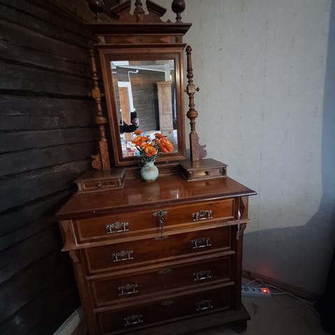 Puupeili lipasto, jossa viidellä vetolaatikkoa ja keskellä oleva peili. Lipasto on valmistettu puusta ja sopii esimerkiksi makuuhuoneeseen tai pukeutumishuoneeseen.
