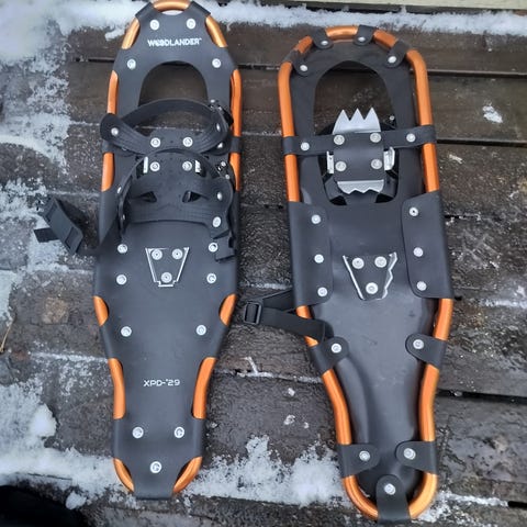 MSR Lightning Ascent lumikengät, koko 27 tuumaa, musta alumiinirunko. Lumikengät on suunniteltu tarjoamaan tukea ja kestävyyttä lumisissa olosuhteissa. Mukana kantolaukku säilytystä ja kuljetusta varten.