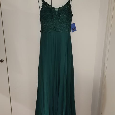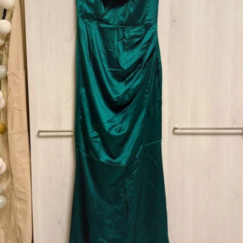 Kerran käytetty ja erittäin siistikuntoinen ompelijalla mittatilauksena teetetty wanhojen päivän mekko tai muu juhlamekko. Kangas ryhdikästä ja tyylikästä juhlapukukangasta. Väri tummanvihreä/ smaragdinvihreä. Mekossa erillinen alaosa, yläosa, tylli-alushame sekä pieni käsilaukkupussi. Koko M-L.