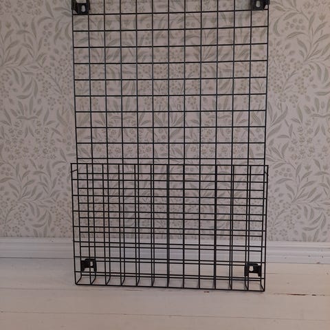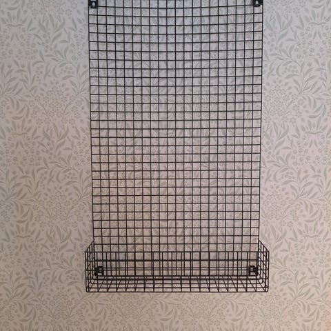 Musta metallinen säilytystaulu hyllyllä, klipsuilla ja korilla. Lisäosia voi ostaa Granitista.