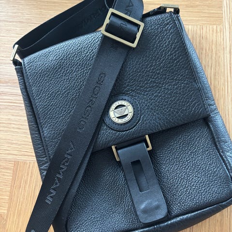 Armani Collezioni nahkainen laukku, musta väri, unisex-malli. Laukussa on vetoketjusulku ja säädettävä olkahihna. Sopii jokapäiväiseen käyttöön ja erilaisiin tilaisuuksiin.