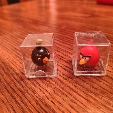Kaksi Angry Bird's figuurit yhdessä pakkauksessa. Käyttämättömät