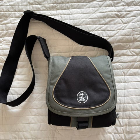 Crumpler kameralaukku, hyvässä kunnossa. Koko noin 25 cm x 20 cm x 15 cm, sopii hyvin järjestelmäkameran ja vaihto-objektiivin roudailuun.