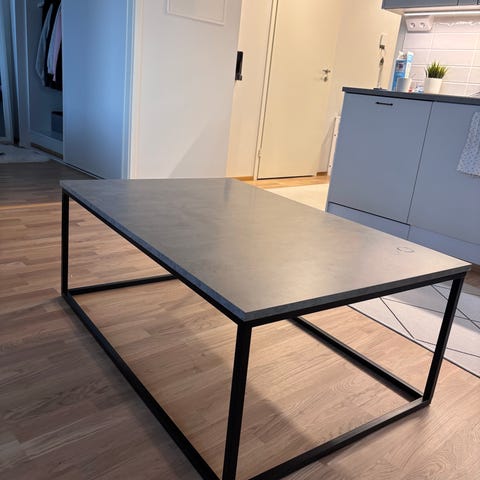 Hieno ja isohko Jyskin sohvapöytä, jossa valkoinen "maitolasi" taso ja messinkinen runko. Pöydässä on kaksi tasoa, jotka tarjoavat lisätilaa esineille. Moderni ja minimalistinen muotoilu.