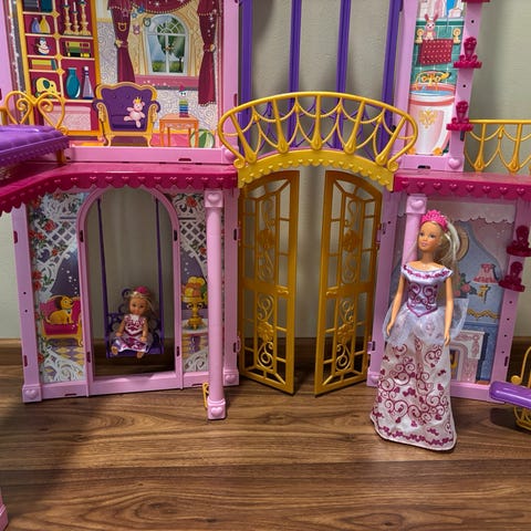 Myydään iso linna puulevyä. Barbit havainnollistamassa kokoa, lelut eivät tule mukaan. Kaari keskellä ei pysy kunnolla kiinni, mutta itse linna ehjä ja ylös syttyy valo.