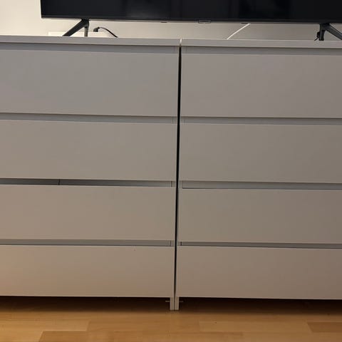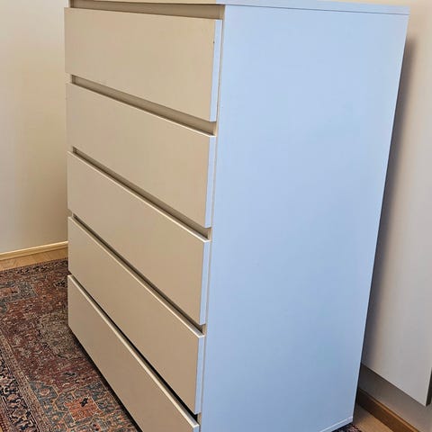 Annetaan hyvässä kunnossa oleva Ikean valkoinen Malmi lipasto, jossa on 4 laatikkoa. Ulkopuolelta hyvässä kunnossa, mutta ensimmäisen laatikon sisällä kulumaa.