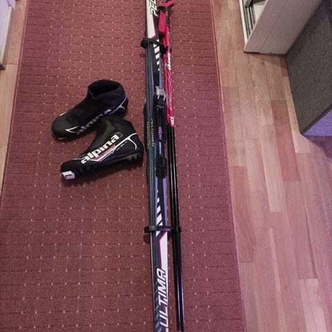 Kaksi talvea vähällä hiihdolla. Ehjät pohjat. Sauvat Mukana. Pituus 125 cm. Toisessa kulumaa kädenpidikkeessä, mutta toimii hyvin.