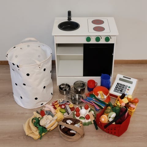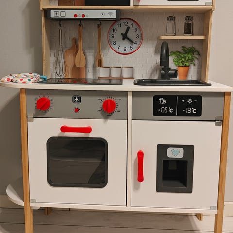 Toimiva leikkikeittiö seuraavalle leikkijälle. Liedessä on toimiva valo ja huriseva ”liesituuletin”.