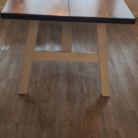 Vuosien saatossa on tullut käytönjälkiä, mutta pöytä ja tuolit ovat hyväkuntoisia.