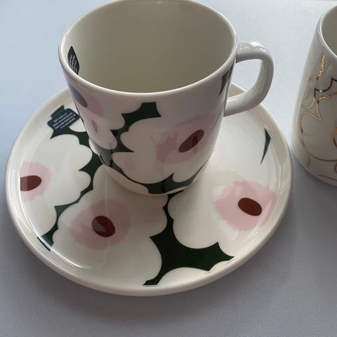 Sarja sisältää kaksi teekuppia ja kaksi lautasta. Materiaali keramiikka. Eivät ole Marimekon.