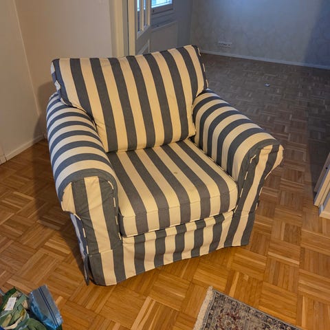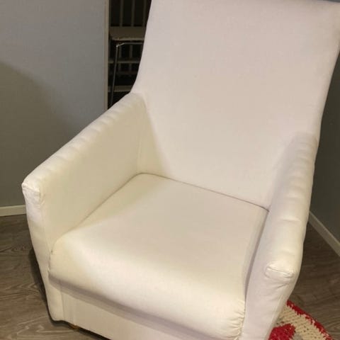 Laadukas nojatuoli, kissa raapinut tyynyjen alta/välistä runkoa, ei näy mihinkään. Myös hieman käsinojien kulmia, ei tosin pahasti... Kuvat kertoo.