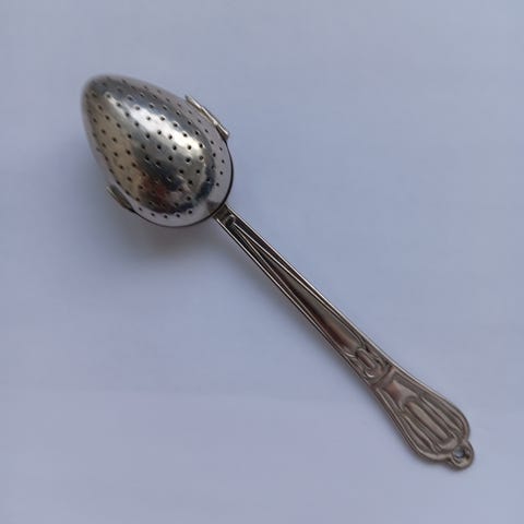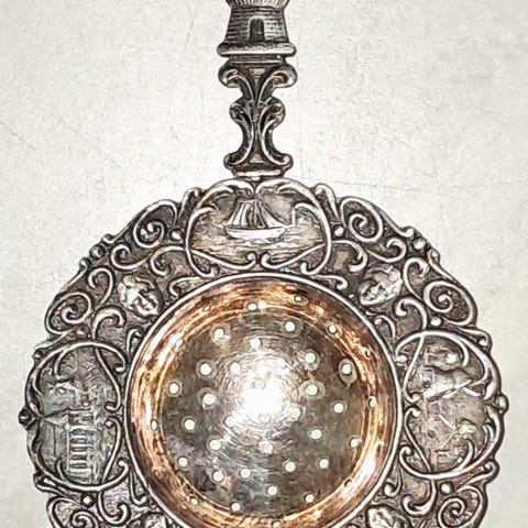 Antiikkinen koristeellinen teesihti, pituus 18,5 sm. Merkki: ALP UH Hopea Jaloste Oy