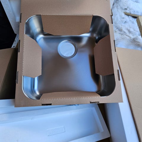 Käyttämätön allas tarvittavine kiinnikkeineen.