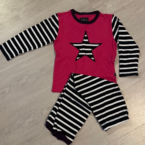 Ristomatti Ratia lyhythihainen pyjama. Koko 100cm, vastaa noin 104cm. Yhdellä lapsella ollut, ihan ok kunto, paidassa nukkaa. Aina hajusteettomasti pesty.