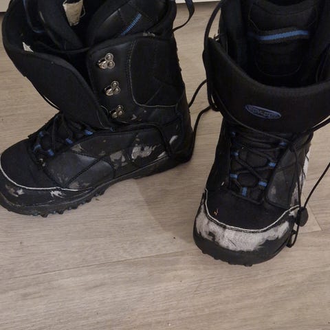 Annetaan noutajalle kuvan lasketteluhousut. Vetskarit ja henkselit toimivat hyvin. Housuissa on käytön jälkiä, jotka näkyvät läheltä katsottuna. Käyttäisimme näitä yhä, elkeivät olisi jääneet pieniksi.