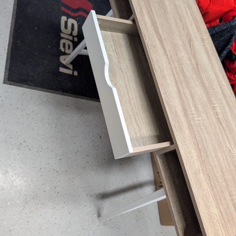 Valkoinen pöytä, metalliset jalat. Hyvässä kunnossa, muutama pieni kolhu tullut käytössä.