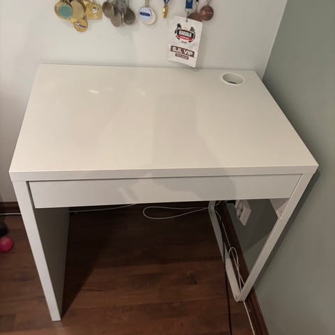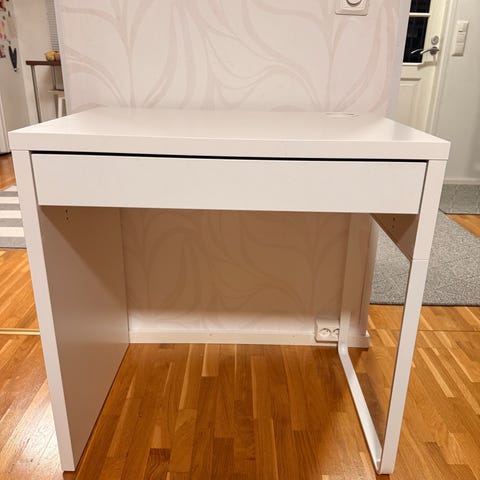 Uudenveroinen valkoinen pieni Ikea Micke työpöytä.