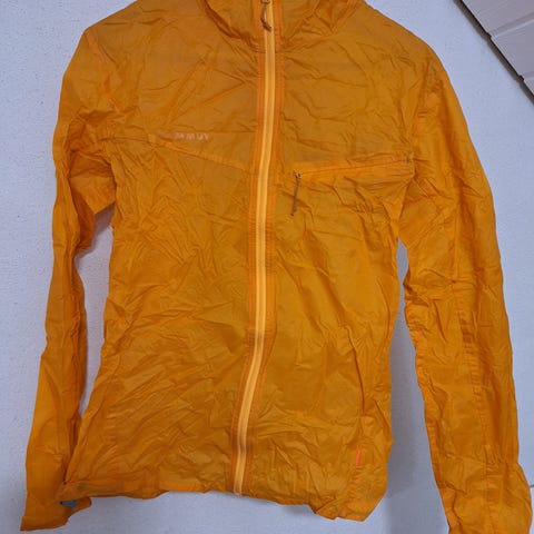 Erittäin kevyt Mammutin kuoritakki, koko M, väri sininen. Mallinimeä en muista, mutta Mammutin keveimpiä takkeja. Ollut sadevarana yhdellä reissulla, mutta todettu itselle aavistuksen pieneksi. Kainalotuuletukset, kaksi taskua, huppu.