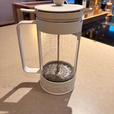 Ranskalainen pressopannu, jossa läpinäkyvä lasikannu ja musta muovinen kahva sekä kansi. Soveltuu kahvin valmistukseen.