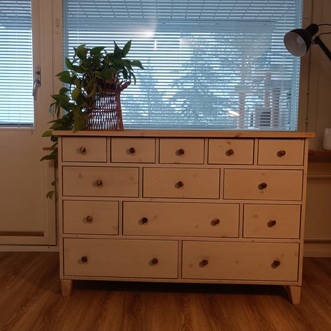 Rustiikkinen senkki on hyvin pidetty, mutta ajansaatossa hieman kulunut. Kaikki ehostettavissa uudella maalilla. Senkin kansi on maalattu ruskeasta mustaksi. Vain nouto.