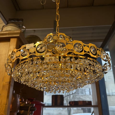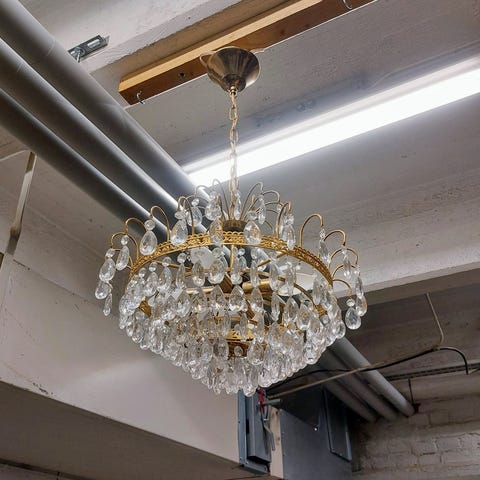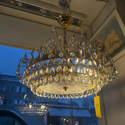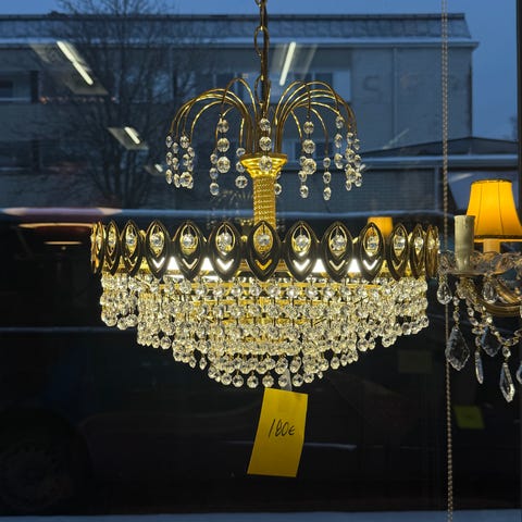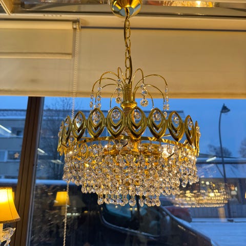 Kaunis kristallivalaisin. Toimiva. 9 valopistettä. Ilman varjostimia. Kaikki kristallit tallessa. Halkaisija noin 50cm, korkeus n. 90cm, joka lyhennettävissä.