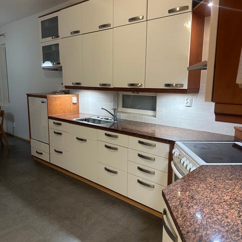Keittiön yläkaapit vaaleaa puuviilua